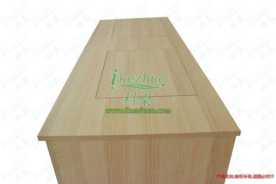 4、当不使用显示器时,可手动按下显示器翻盖面板至桌面平整,显示器自动锁住隐藏在桌子内部,此时整个桌面成一个平面状态