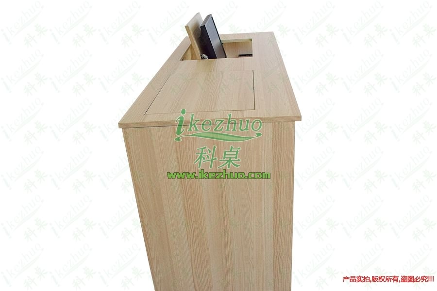 当需要使用显示器时轻按前端桌面板隐藏在桌子内部的显示器会自动从桌子下面升到桌面翻转到合适角度。当不使用显示器时,可手动按下显示器翻盖面板至桌面平整,显示器自动锁住隐藏在桌子内与桌面保持平整一致。起到防尘,防盗,保持桌面平整美观。使用方便,手动控制,翻转自如。