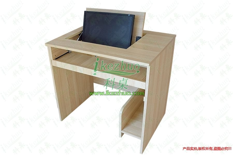当需要使用显示器时轻按前端桌面板隐藏在桌子内部的显示器会自动从桌子下面升到桌面翻转到合适角度。当不使用显示器时,可手动按下显示器翻盖面板至桌面平整,显示器自动锁住隐藏在桌子内与桌面保持平整一致。起到防尘,防盗,保持桌面平整美观。使用方便,手动控制,翻转自如。