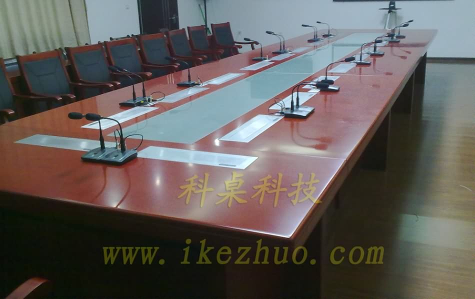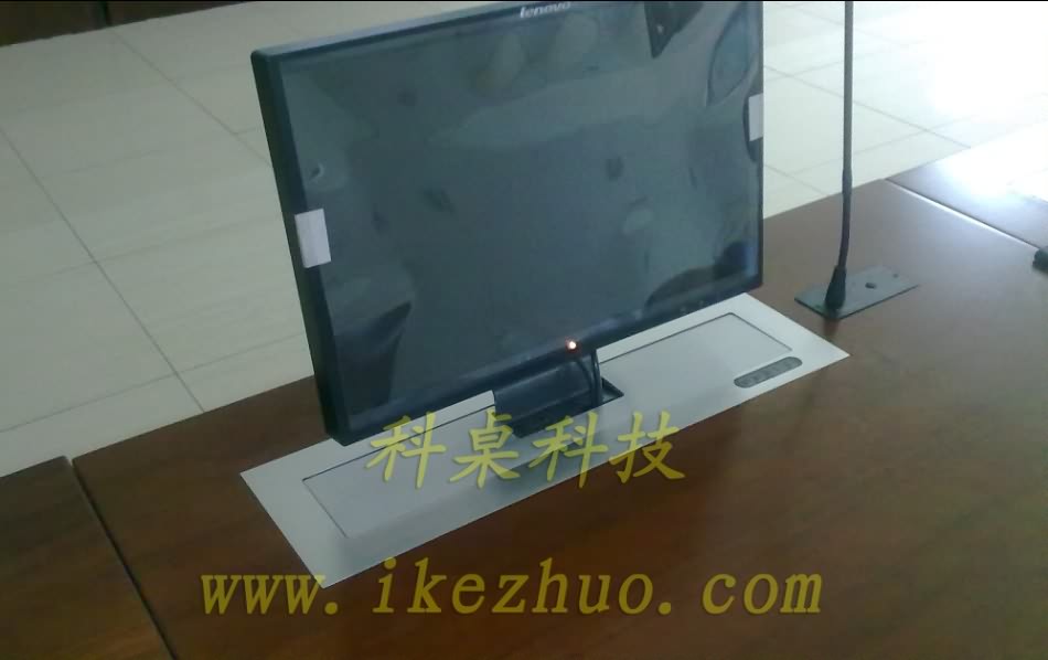 面、当不使用显示器时,升降机自动下降,显示器隐藏在会议桌内,起到