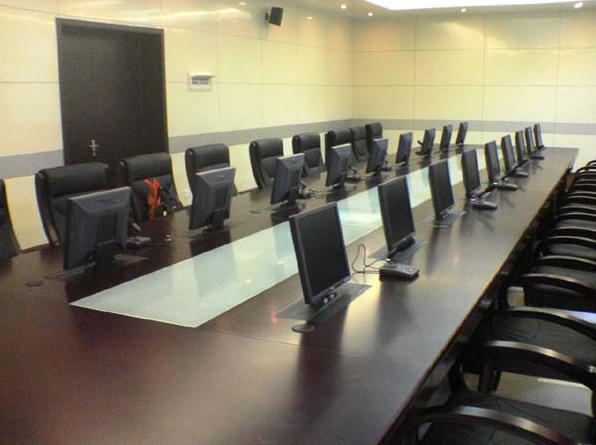 当需要举行会议时隐藏在会议桌内的升降器把液晶显示器从会议桌下面自动升到桌面并仰成一定角度,