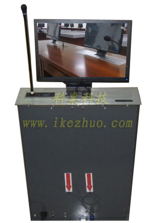 19寸科桌液晶屏升降器需要使用显示屏时,隐藏在会议桌内部的升降机把显示屏从会议下面升到桌子表面;当不使用显示屏时,升降机自动下降,显示屏隐藏在会议桌内部,防盗、防尘;保持桌子表面的平整和美观。