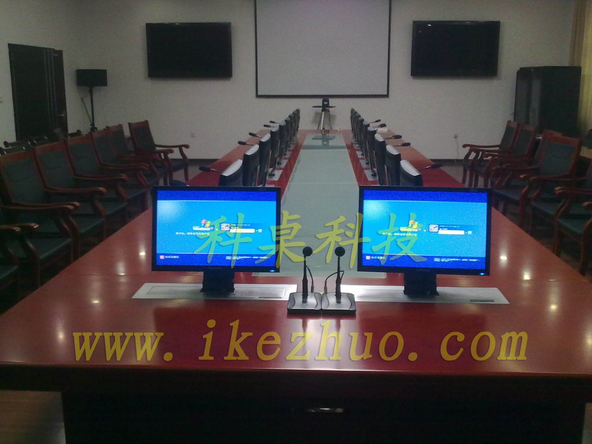 需要使用显示屏时,隐藏在会议桌内部的升降机把显示屏从会议下面升到桌子表面;当不使用显示屏时,升降机自动下降,显示屏隐藏在会议桌内部,防盗、防尘;保持桌子表面的平整和美观。